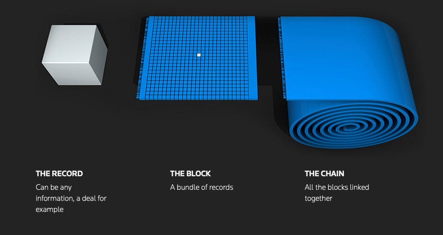 Dans le monde de la blockchain, nous n’utilisons plus un parchemin, mais une chaine de blocs — d’où le nom « blockchain » qui signifie en anglais « chaine de blocs ».
